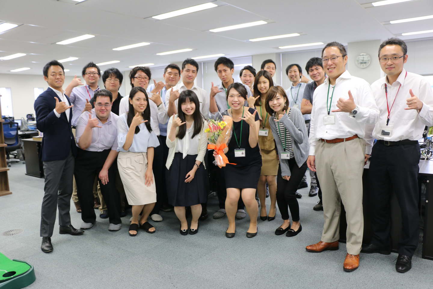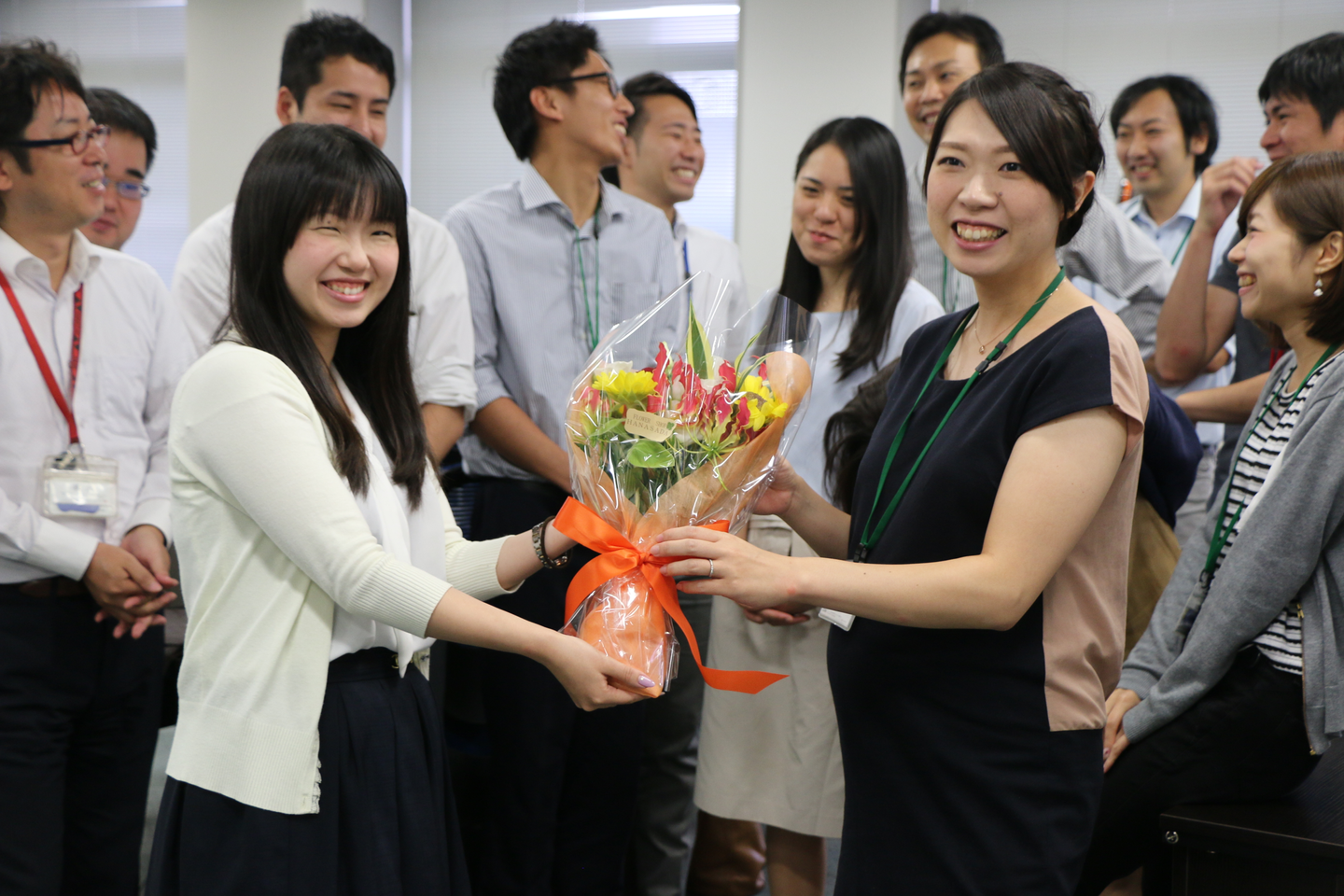こんにちは。MASASHIです。今日は二度目の産休へ突入するSAYUMIさんをプチ激励。同期入社のMISA(左側)に花束を渡してもらいました。産休前に挨拶出来ていない方が多くいる事を気にしていたので、お世話になった野郎どもは彼女に激励のメッセージをお願いします。