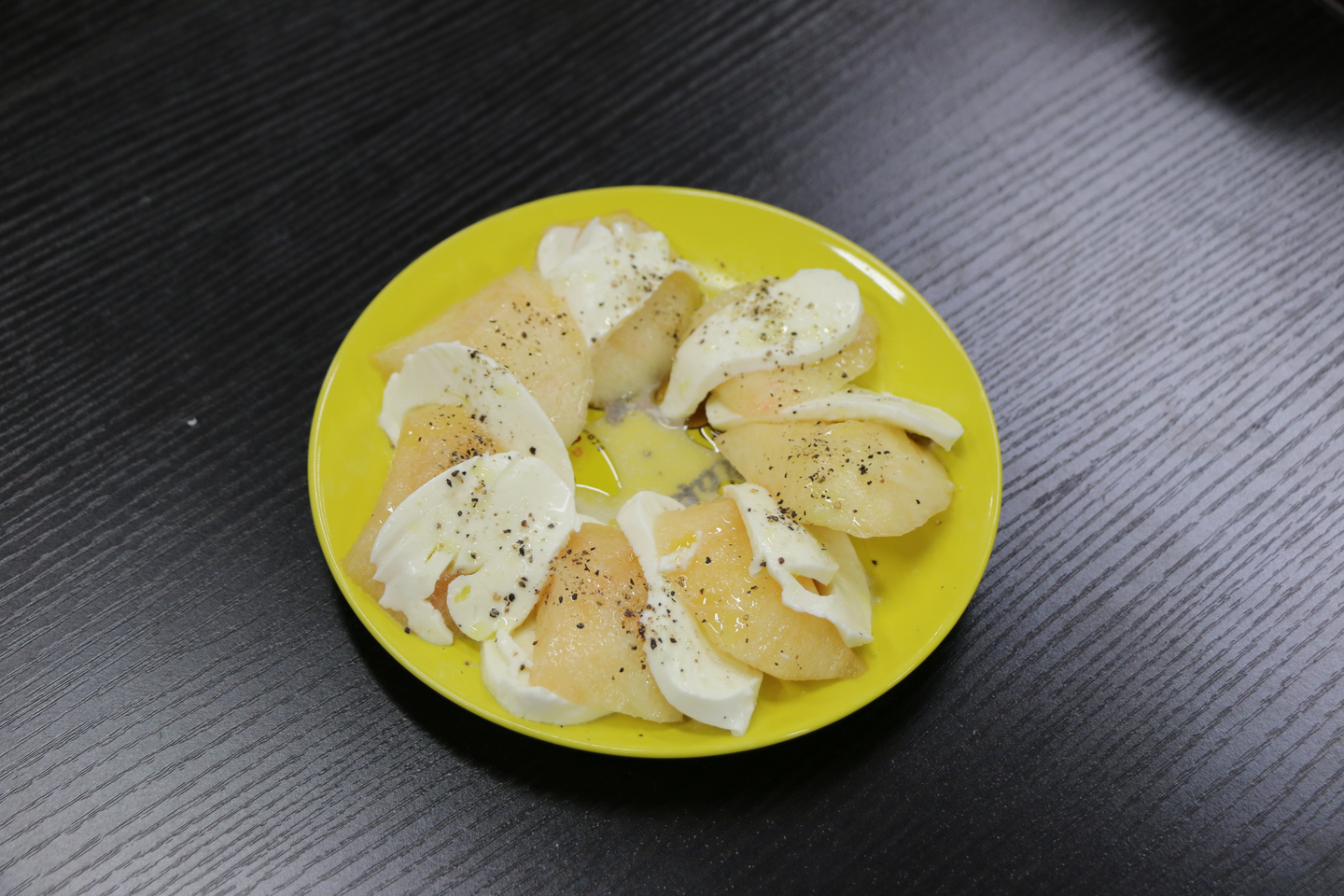 #桃モッツァレラという食べ物。薄切りの桃とモッツァレラチーズを交互に並べ、オリーブオイルと胡椒を眩すという意識高い系フルーツ。女性社員が作ってくれたのですが、これは女子力激高。破壊力抜群です。