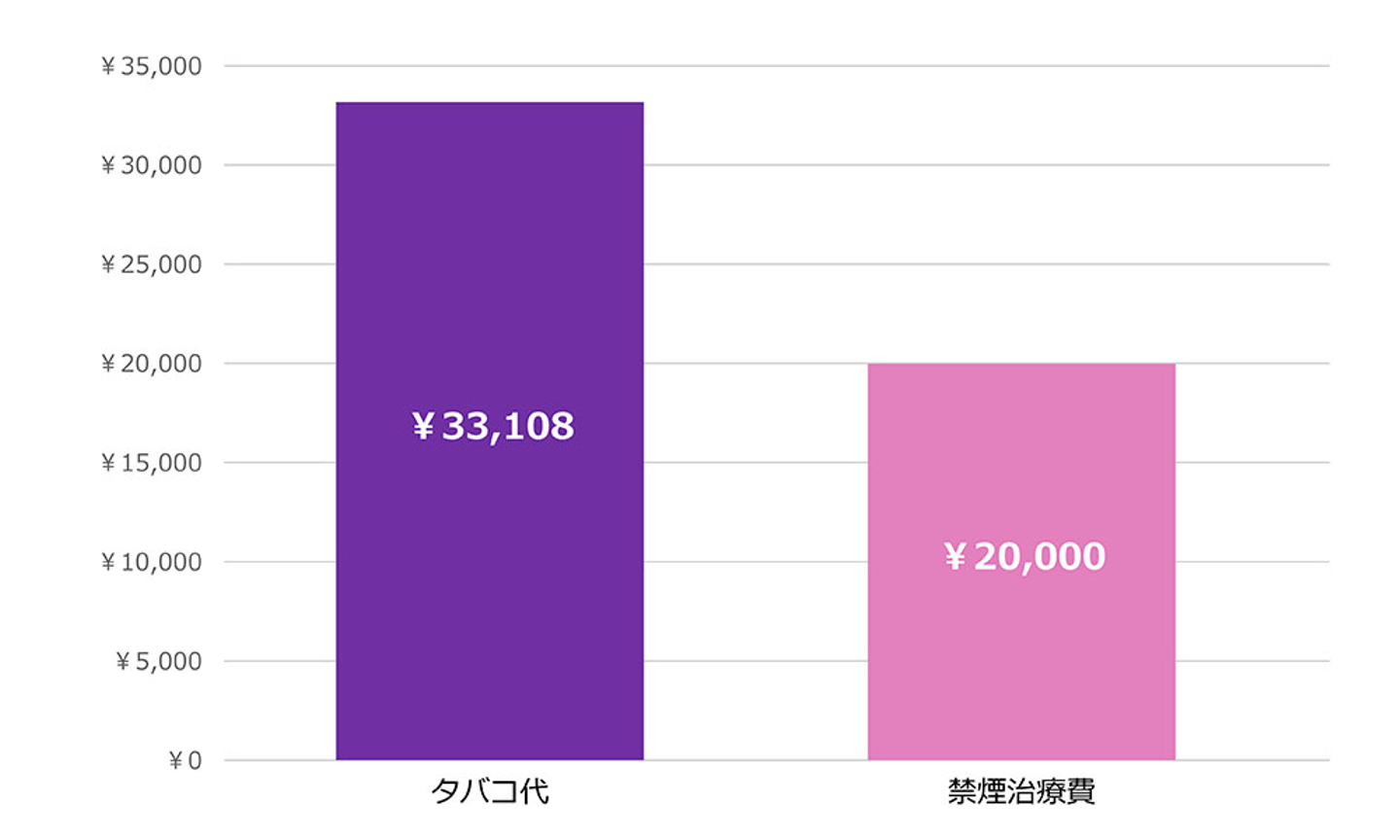 すぐ禁煙.jpの調べによると、健康保険等適応時の禁煙外来費用の自己負担金は一般的に、8~12週間で約13,000円~20,000円(※2)と言われています。また、社内アンケートによると社員一人当たりの12週間のタバコ費用は平均33,108円のため、一般的な禁煙外来費用の方が安いことがわかります。