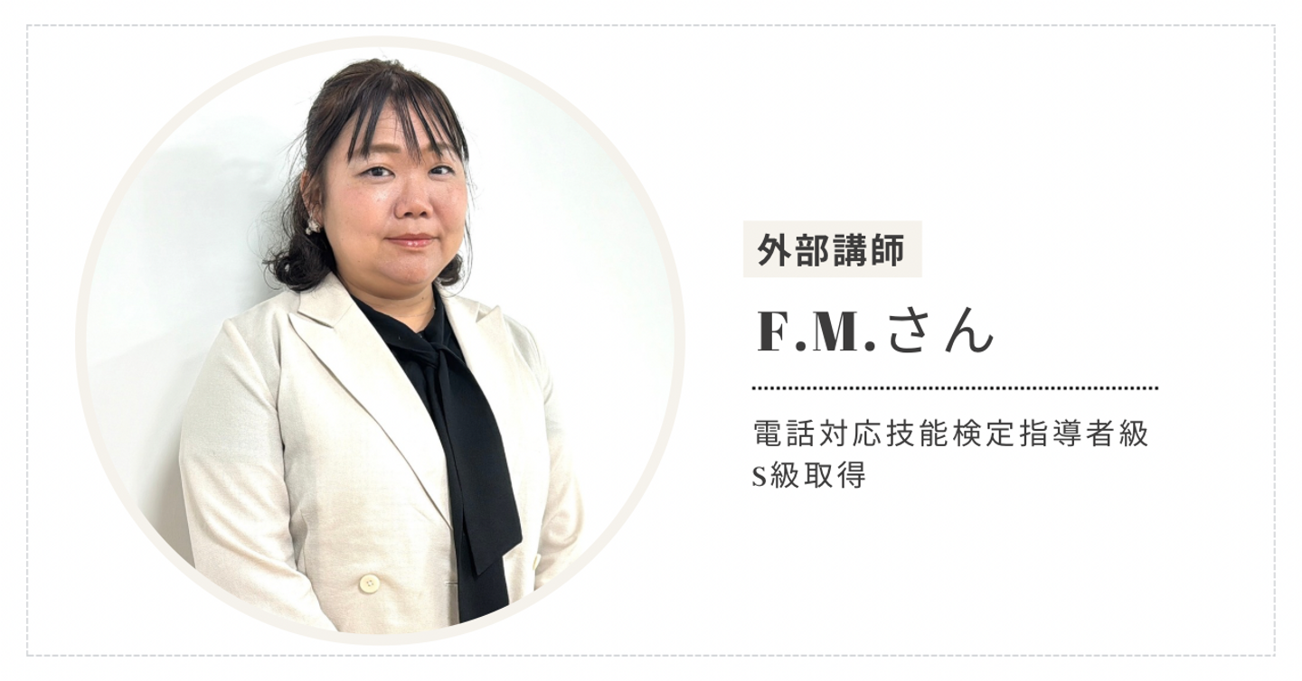 外部講師:F.M.さん【プロフィール要約】企業内講師を業務として実施しながら、自己スキル向上の為、電話応対技能検定指導者級(S級)取得。その後、応対指導講師として、コールセンター等運営される企業様の応対品質向上に寄与。