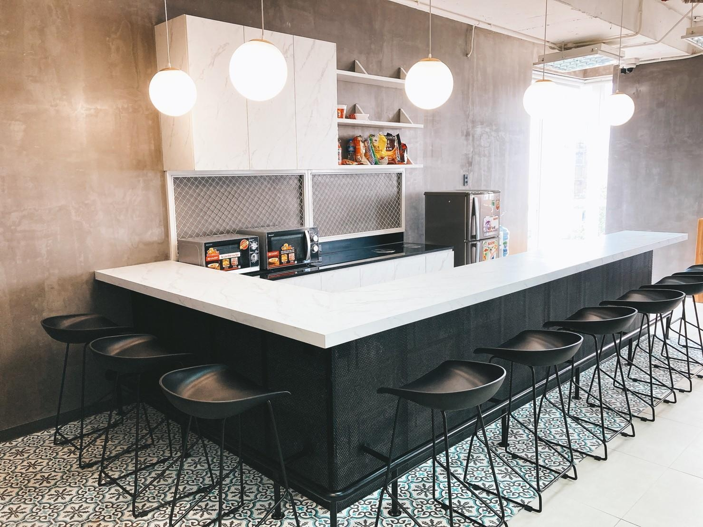 仕事の合間にくつろげるカフェスペースと、カフェカウンターも社員に好評です。