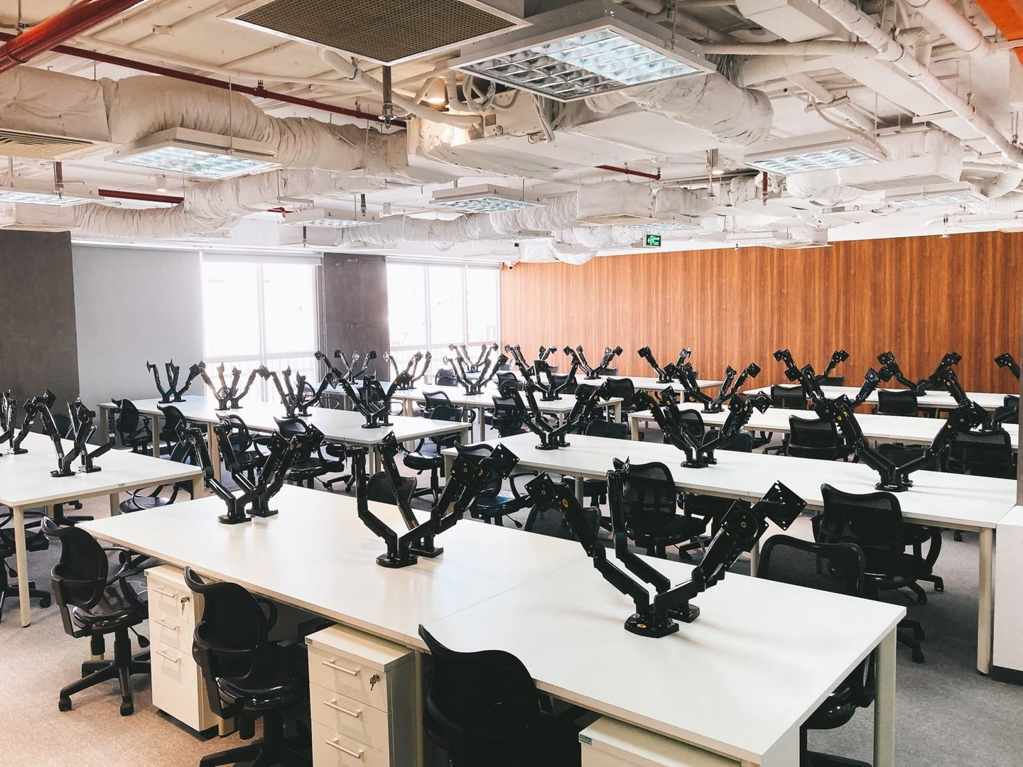 全社員にデュアルモニター用のモニターアームを配置しています。
