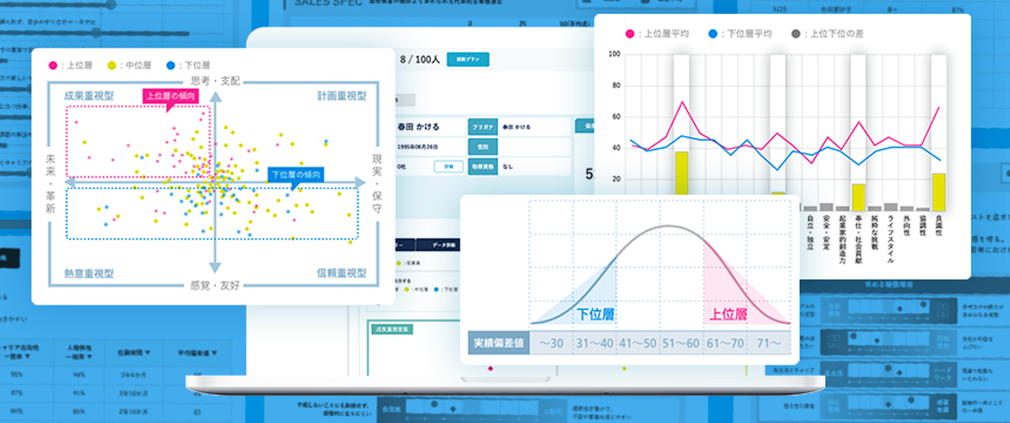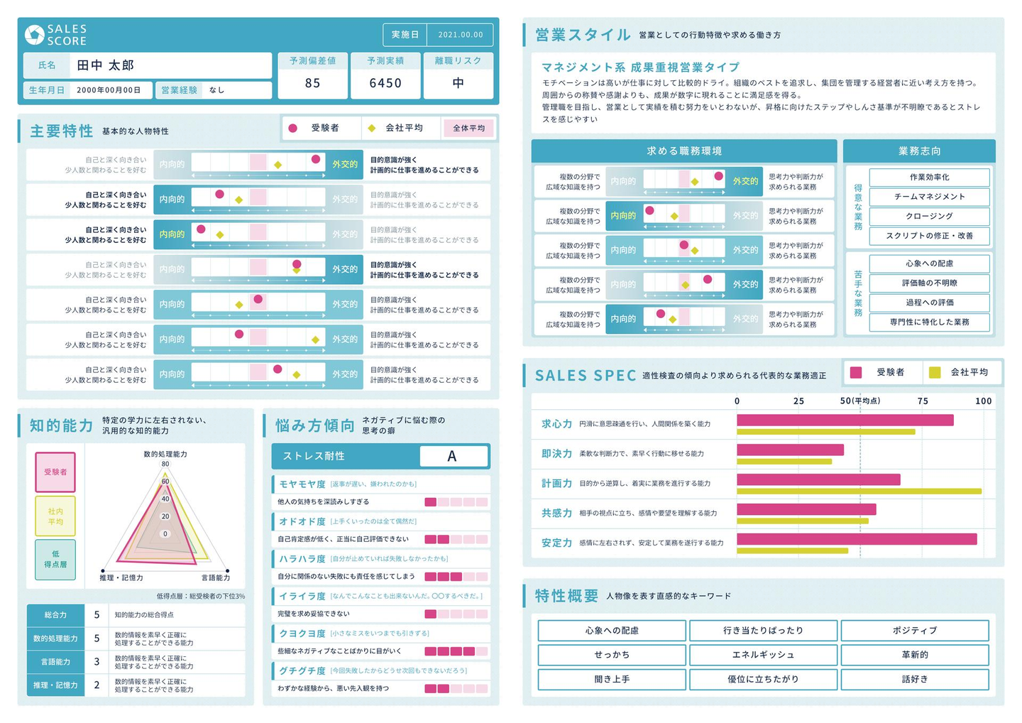適性検査といえばリクルートさんのSPIが最も有名ですね。適性検査とは採用の精度を上げることを目的として面接では見抜けない人物の能力や性格といった特性を定量的に評価するツールです。セールススコアは営業職に特化したWEB適性検査として日本ではじめて展開されました。数千名のセールスパーソンのデータと受検者の特徴を比較できる他、導入いただいたチームが他の組織と比べて何が違うのか、その傾向を可視化します。