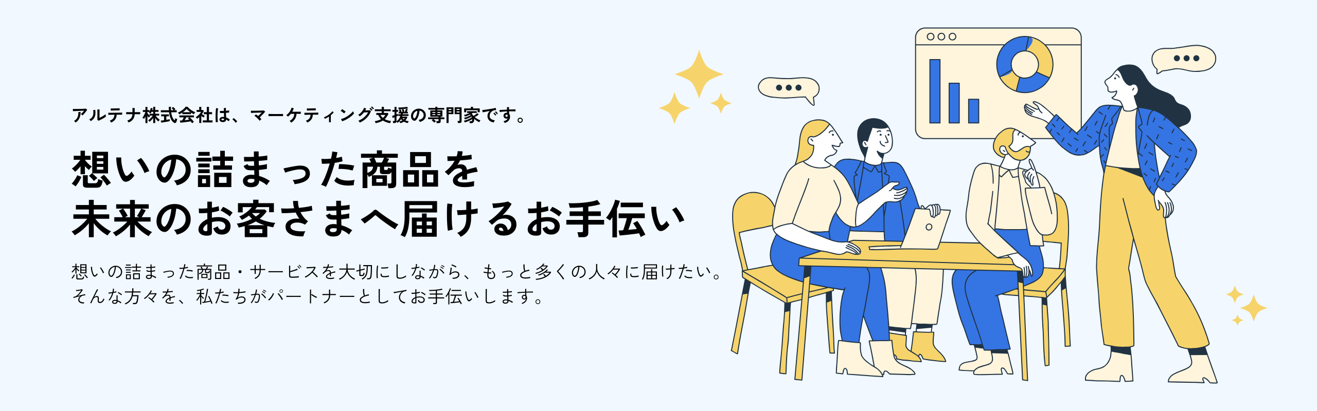 私たちはクライアント一社一社に個別のマーケティング戦略・実行方法をご提案し、外部マーケティングチームの組成と運営体制の立ち上げ、そして施策の実行までを支援しています。こだわりのある商品やサービスを、画一的な施策に当てはめるのではなく、最も魅力が伝わる方法、届けたい方々に喜んでもらえる方法を、私たちは考えます。 クライアントに合わせた選択肢を提案・実行し、ビジネスの成長にコミットするのがアルテナ株式会社のメンバーです。