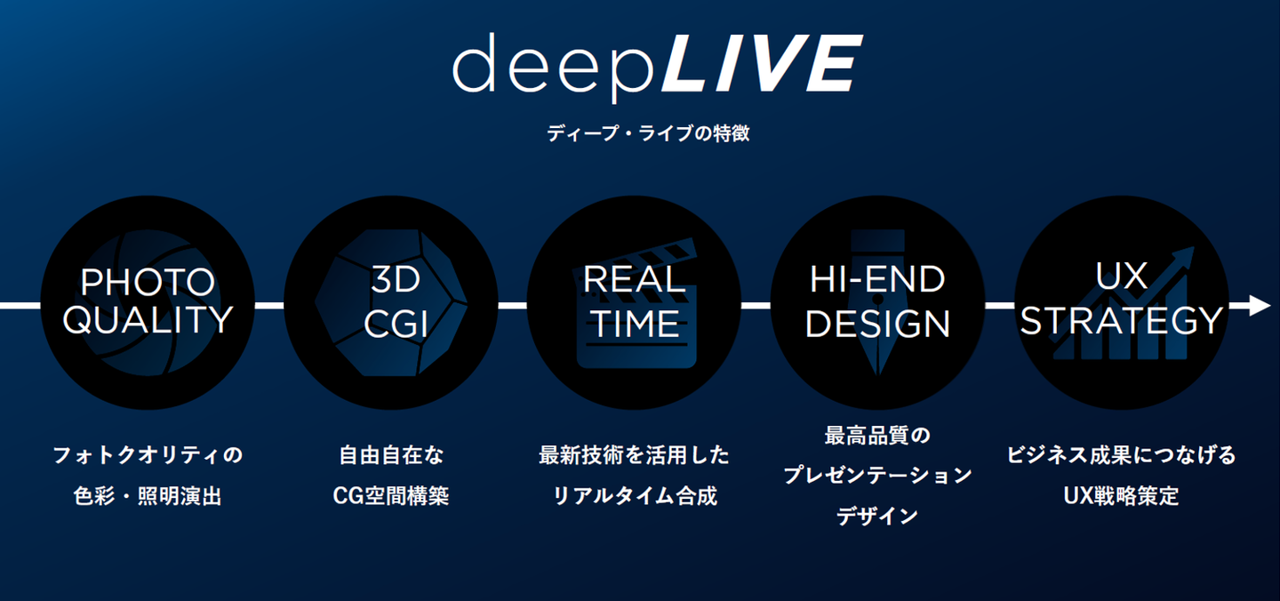 「deepLIVE ™」チームには、下記の5つのクリエイティブ領域において長年培ってきた“技術力”に裏打ちされた専門性の高いメンバーが名を連ねています。