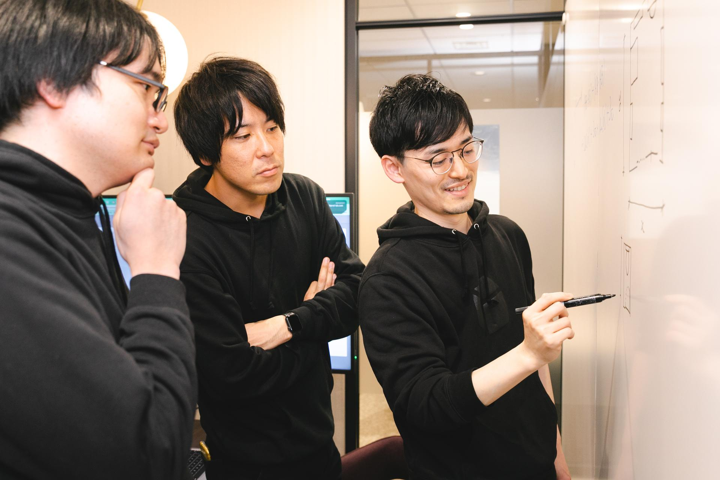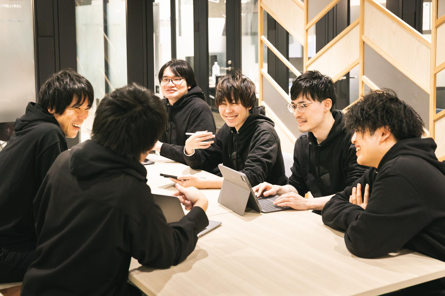 この日は某求人サイト用の写真撮影があったため、忘年会前に一度都内のシェアオフィスに集合しました。慣れない撮影でメンバーも少し緊張のご様子…かと思いきや、少し演技をしてみたり、個人写真でキメてみたり、和気あいあいと進みました。