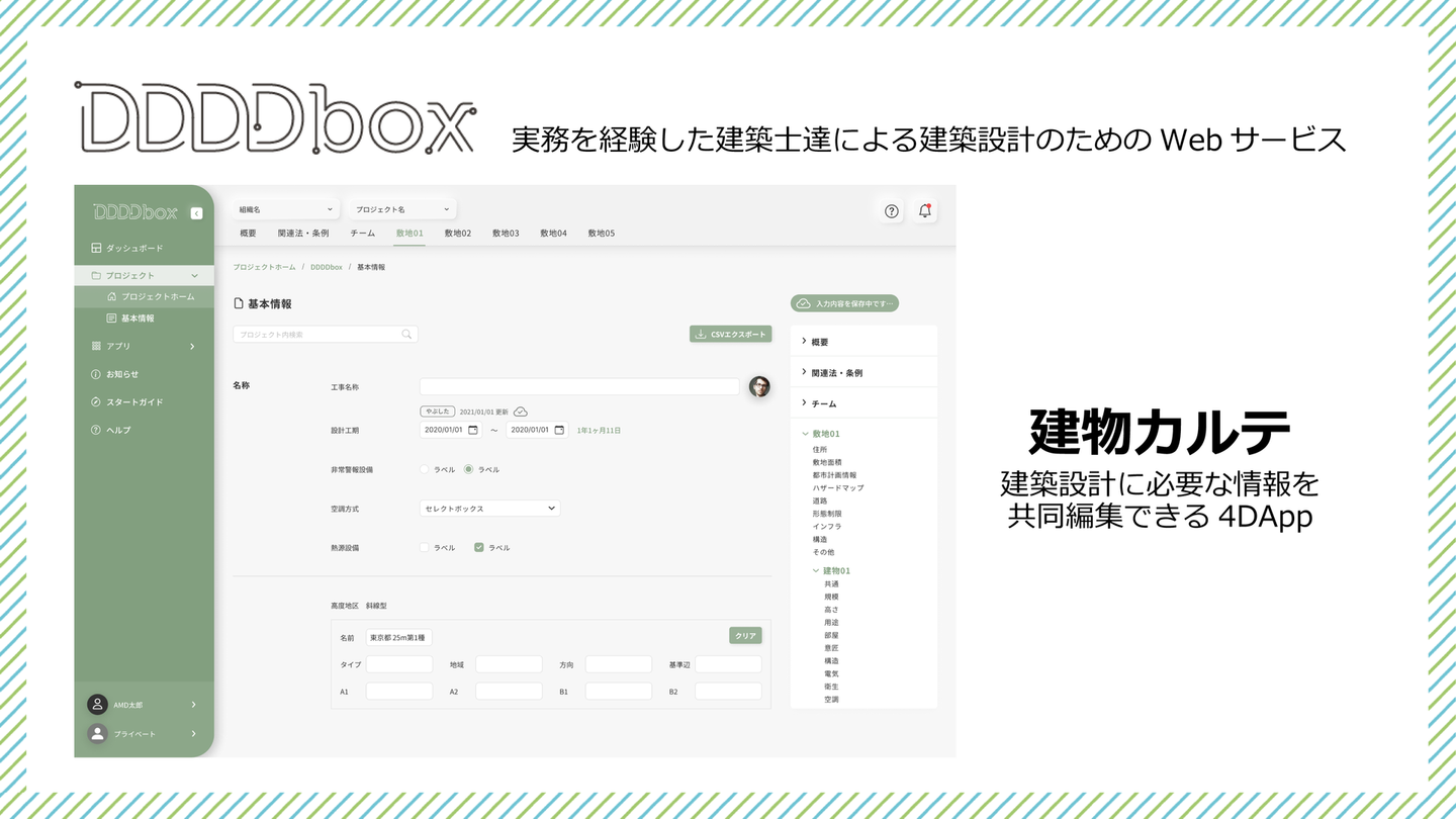 建築設計士が設計業務をより効率的に行えるよう、建築設計業務に特化した様々なアプリケーションをWeb上で提供することで、業務付加を低減し、長時間労働のない業務環境を作りたい。そしてもっとクリエイティブなことに時間を使ってほしい。DDDDboxは、実際に建築設計士として働いていた藤井・松原が、そんな想いで開発したプロダクトです。