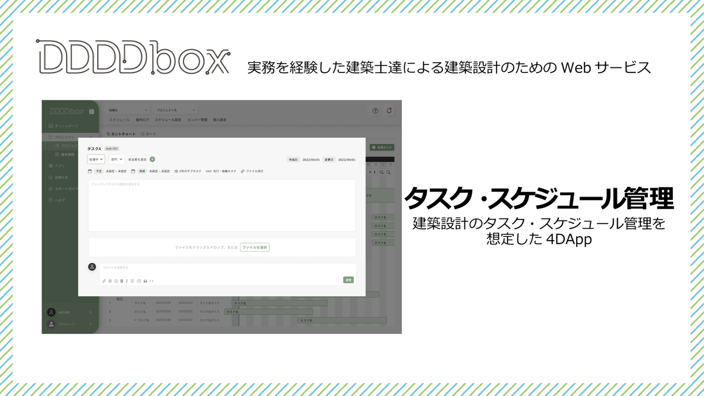 DDDDboxは、Data Driven Design Development boxの略で、データを活用しながら効率的に建築設計業務を進められるよう様々な機能をWeb上で提供するクラウドサービスです。Webブラウザ上で動作するBIM、建物カルテ、タスク管理、スケジュール管理、分析・解析、議事録、勤怠や確認申請対応など、設計業務から分析作業、事務作業まで、デジタルでサポートします。