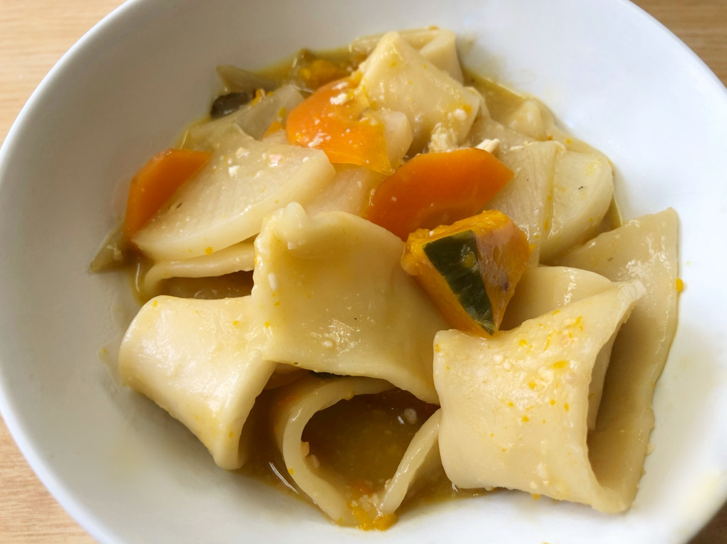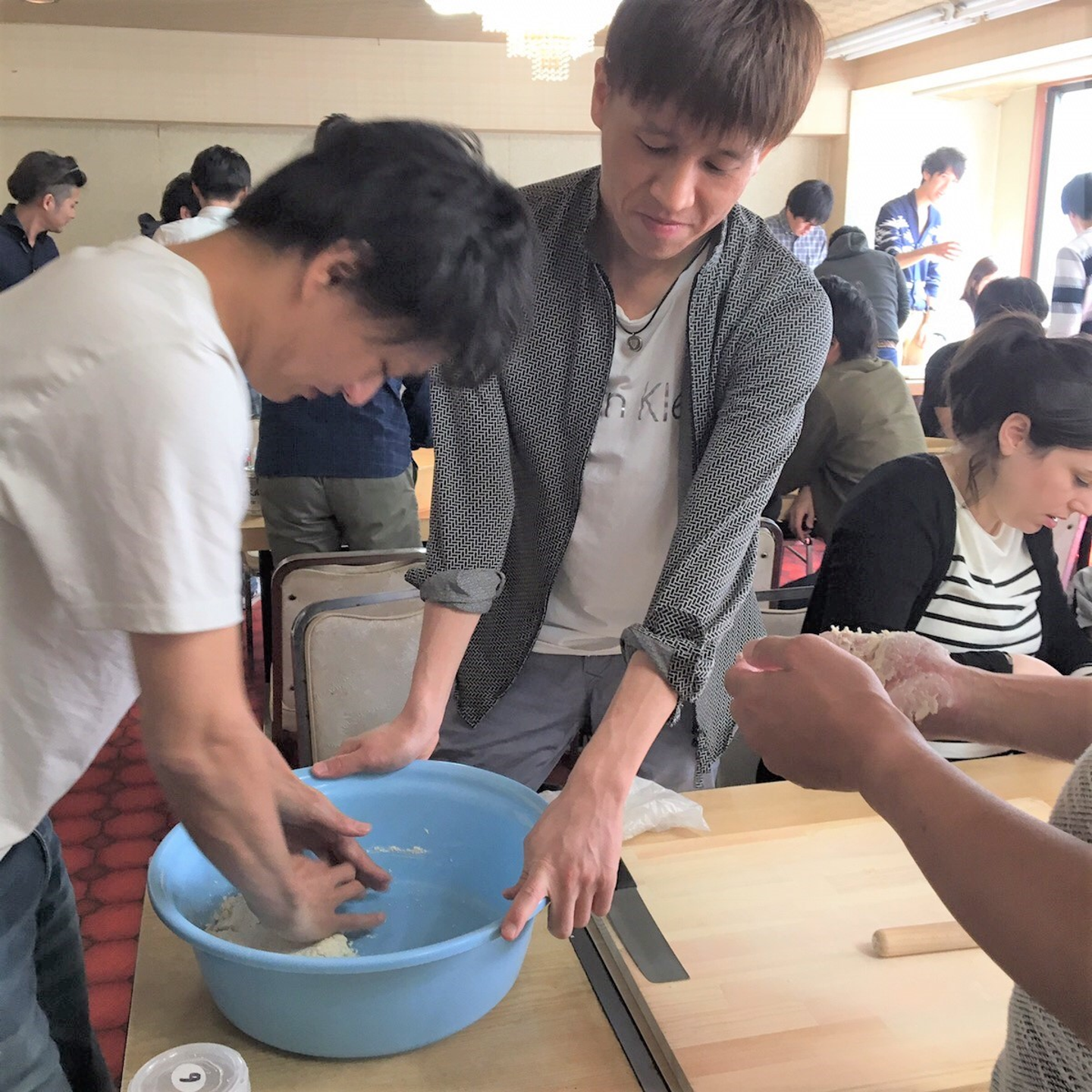 2日目は蓬莱家でほうとう作りをしました。宝探しとは違うチームで麺づくりからスタート!スタッフさんから作り方を教えてもらいながら、麺をこねて2cm幅にカットしていきます。