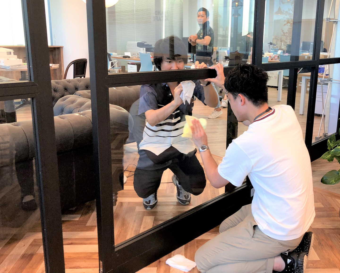1Fと2Fに分かれているので、チームごとに作業場所を決めています。普段なかなか手の届かないところも入念に。観葉植物の葉っぱのほこりや普段使用していない引き戸の汚れ、床の汚れを丁寧にふき取っていきます。