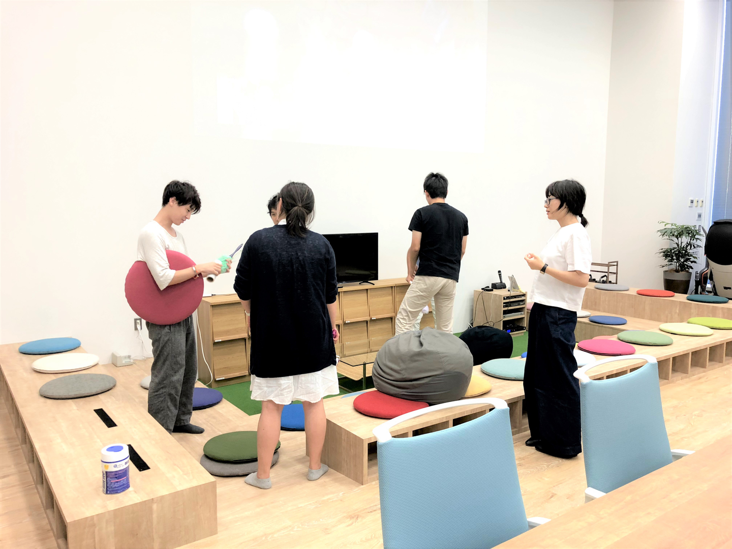 1Fは会議室や執務スペース、芝生エリアととても広いのですが、こちらも丁寧に掃除をしました。クッションの裏にはマジックテープがついており、外してきれいにしました。ちなみに芝生スペースは土足厳禁になっています。