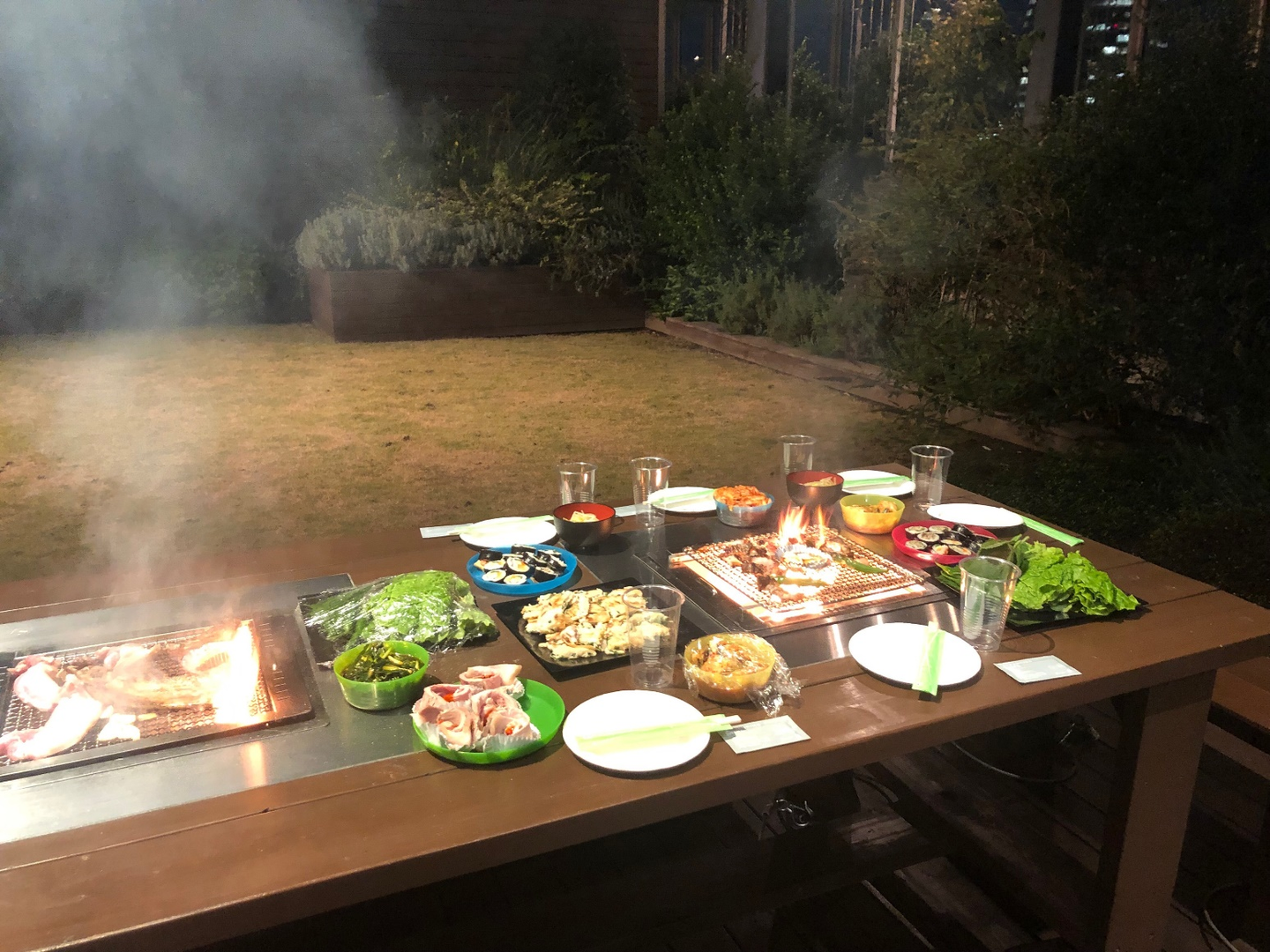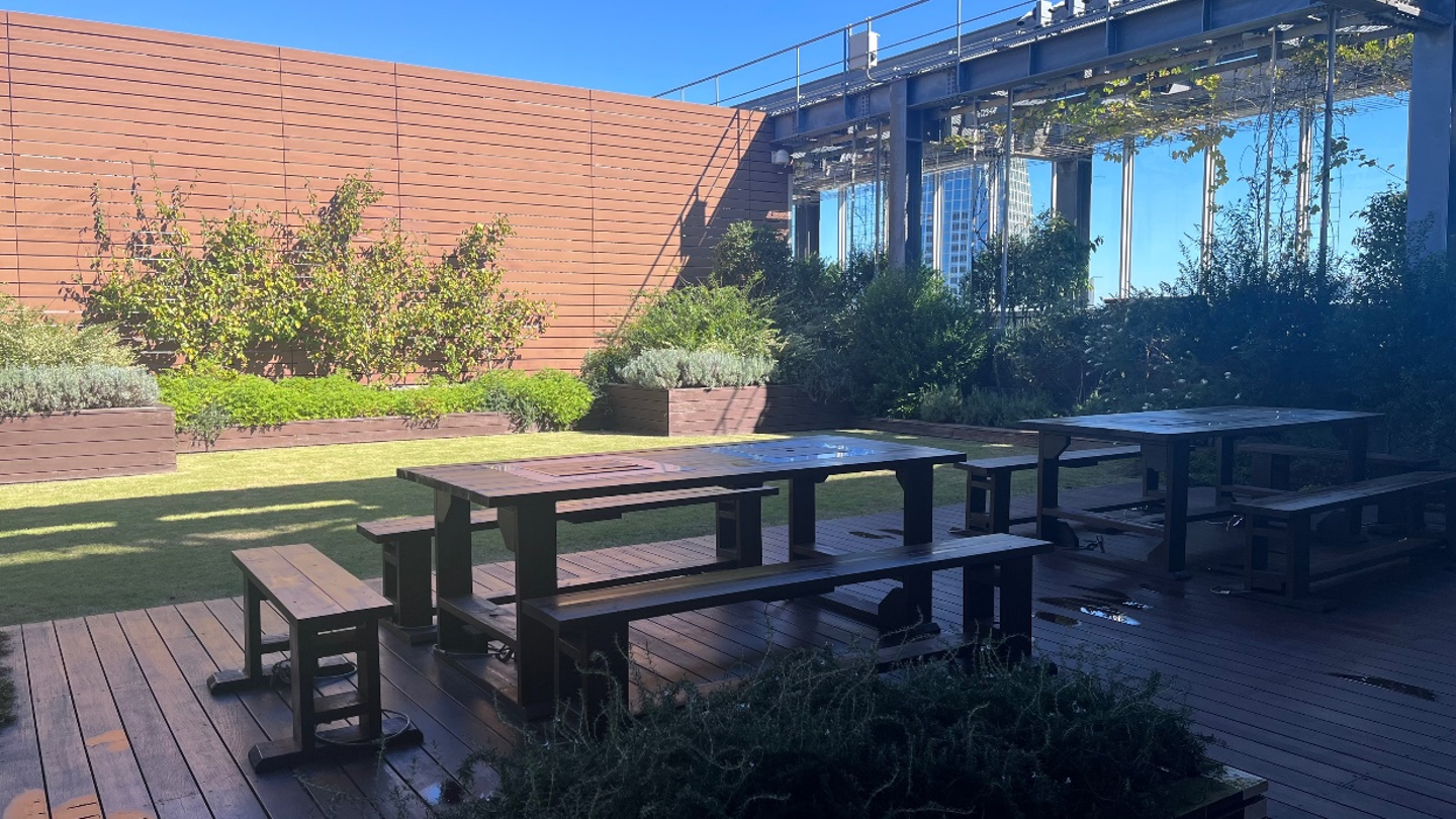 屋上にはバーベキュースペースがあります。コロナ禍で一時クローズしていましたが、コロナ禍になる前は、このバーベキュースペースで新入社員歓迎会をしていました。