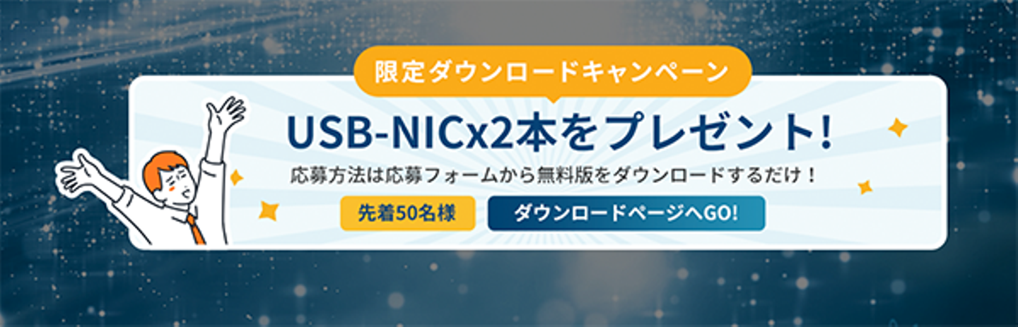 「Freeライセンス」の提供開始を記念して、EXEファイルをダウンロードいただいた方にNEEDLEWORKで動作検証済みのUSB-NIC(2本)を、先着50名様にプレゼントいたします。