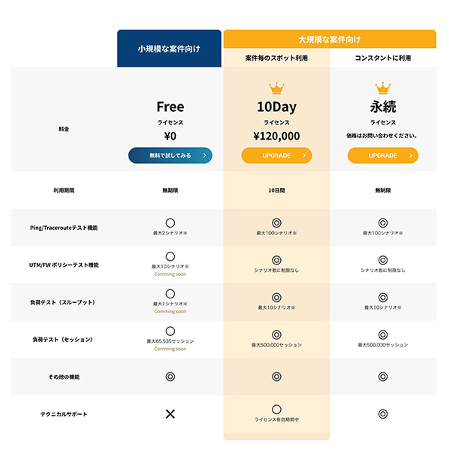 基本的な機能を無期限でご使用いただけます。今回は「ネットワークテスト」のみ先行してのご提供になりますが、「UTM / FWポリシーテスト機能」「ネットワーク負荷テスト(セッション・スループット)機能」は順次提供予定です。検証や小規模案件で気軽にご利用ください。