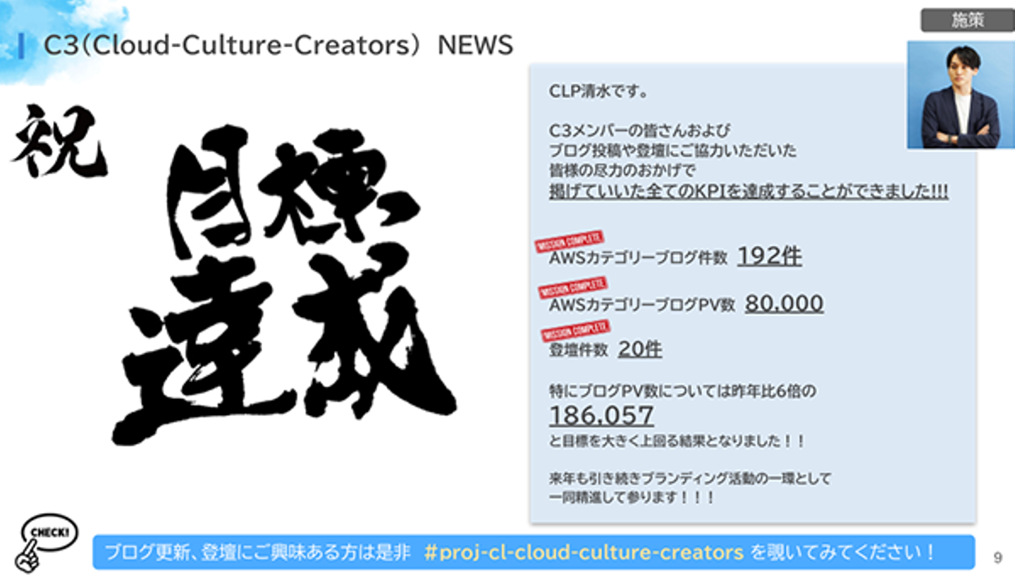 また、社内ではブランディング活動の一環として実施している、部を横断したワーキンググループのマネジメントも担当しています。エンジニアのアウトプット活動を積極的に推進していて、昨年はAWSカテゴリーに注力。ブログの投稿や登壇の機会を増やしたことで、社内外での認知度を高めることができました。