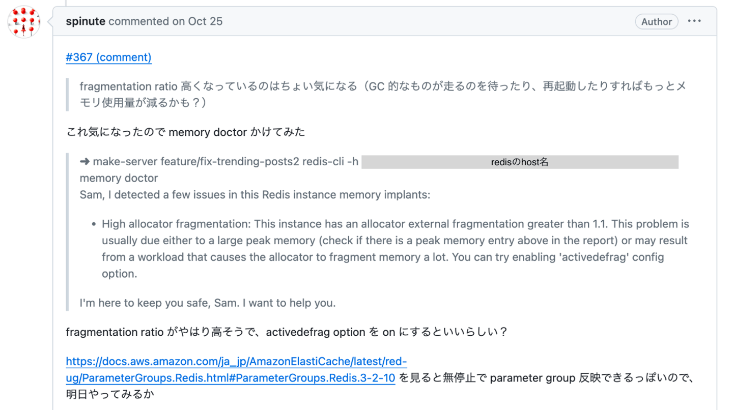なお、メモリの断片化率が高いことが観察されたため、 memory doctorの診断をもとに、activedefragパラメタをonにして、断片化率を下げる、という試みも行われました。