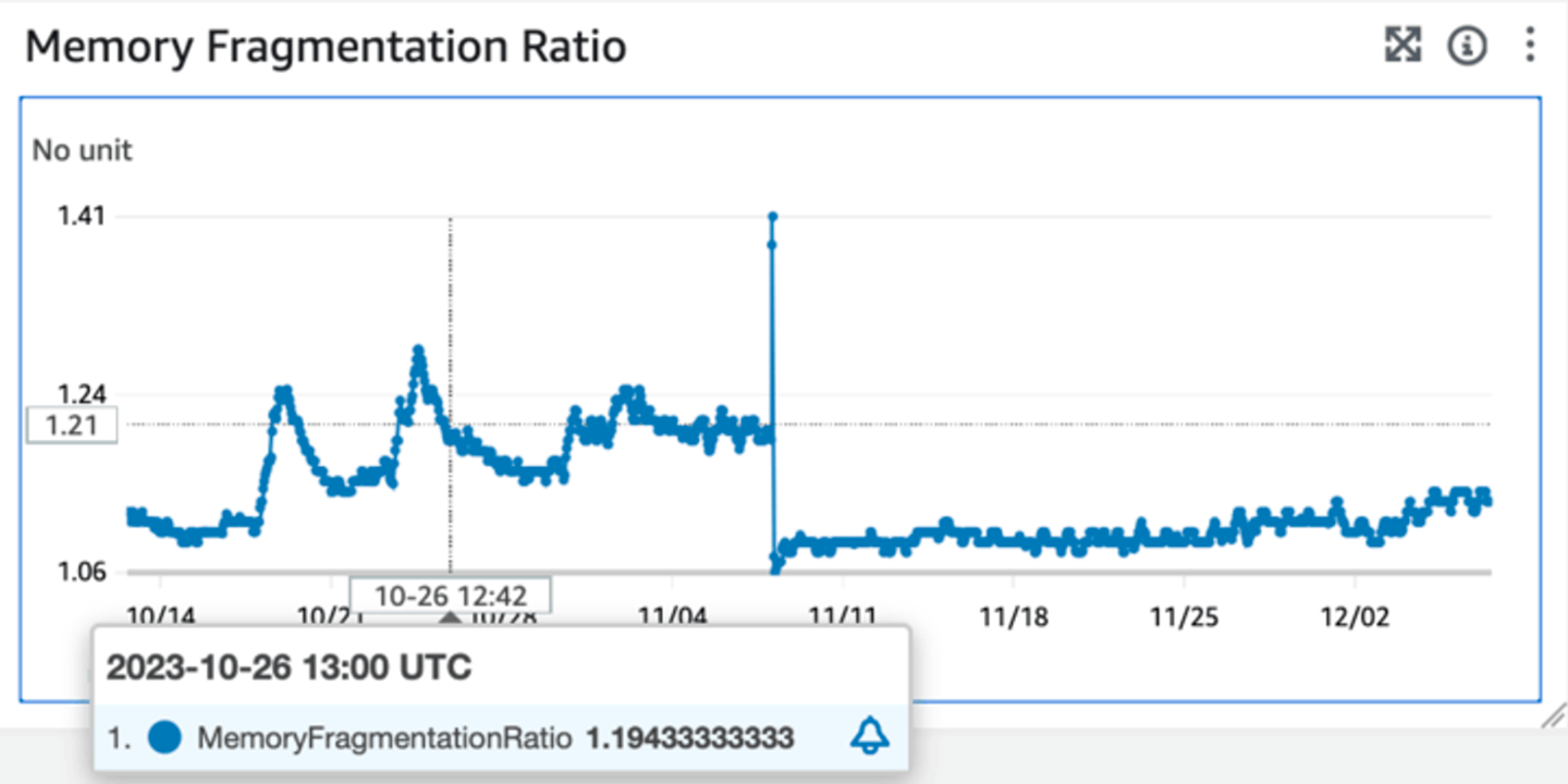 Amazon ElastiCacheのダッシュボードの断片化率の推移は以下のようになりました。