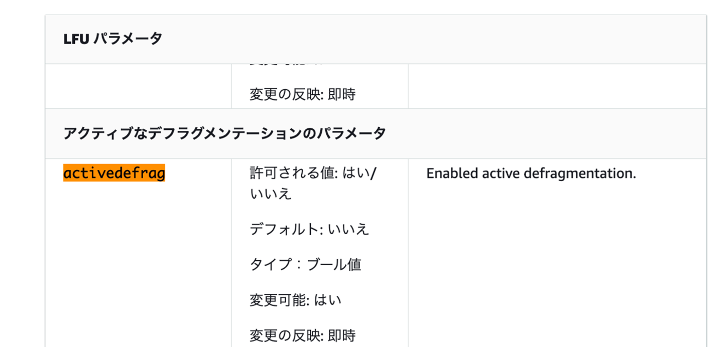 memory doctorコマンド(ドキュメント)を入力すれば使えます。 - activedefragの説明はAmazonElastiCacheのこちらのページ