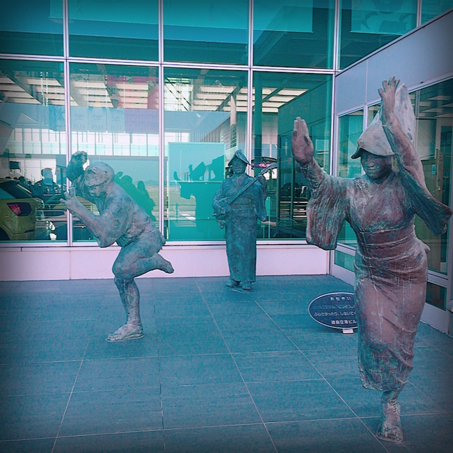 空港の銅像がすでに阿波踊ってる!!ついにこの日が来たと実感。。。たぎります。