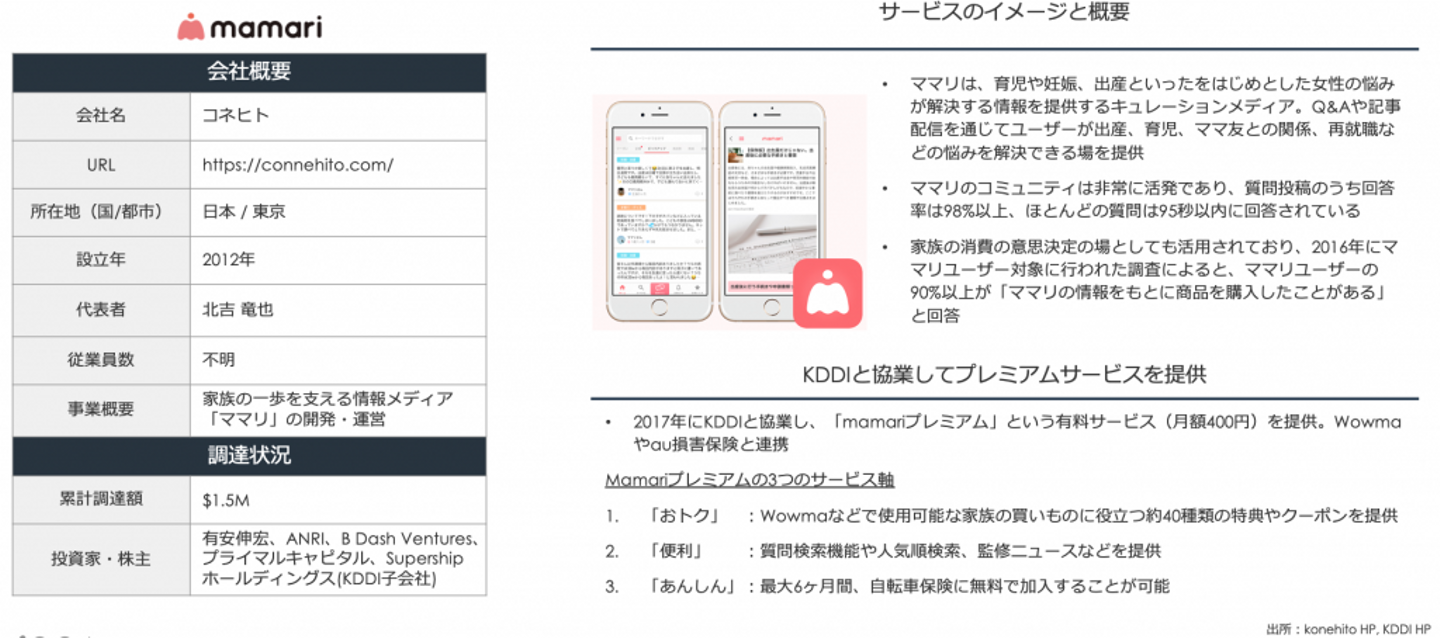 またママリは、メディアとしての広告モデルに加えて、2017年にはKDDIと協業し「mamariプレミアム」という有料サービスの提供を開始、フリーミアムモデルでもマネタイズを行うようになりました。プレミアム会員には、月額400円でクーポン提供や検索機能の拡充、期間限定での保険無料加入サービスを提供しています。