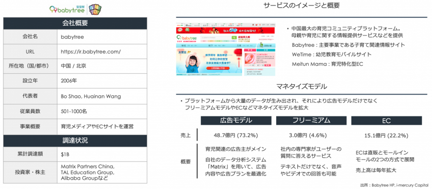 2007年に創業された同社は、SNSコミュニティからEC、オンライン教育まで、幅広くベビー・マタニティに関するサービスを提供して市場を牽引しており、コミュニティのユーザーは2018年時点で889万人と、中国でも随一の育児コミュニティになっています。