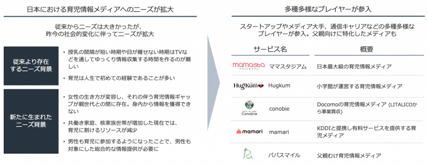 育児情報メディアの領域は、スタートアップのみならず、メディア大手や通信キャリアのような、専門外の事業者も参入するようになりました。また、母親だけでなく父親向けに特化したメディアなど多種多様なものが登場し、レッドオーシャン化しています。