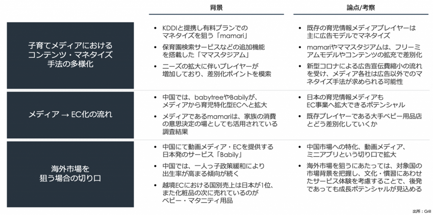 日本の育児情報メディアの領域は多種多様なプレイヤーが進出しており、レッドオーシャンとなっています。多くのプレイヤーが広告モデルでマネタイズを行う中、フリーミアムモデルやコンテンツの拡充で差別化を図るmamariやママスタジアムを紹介致しました。