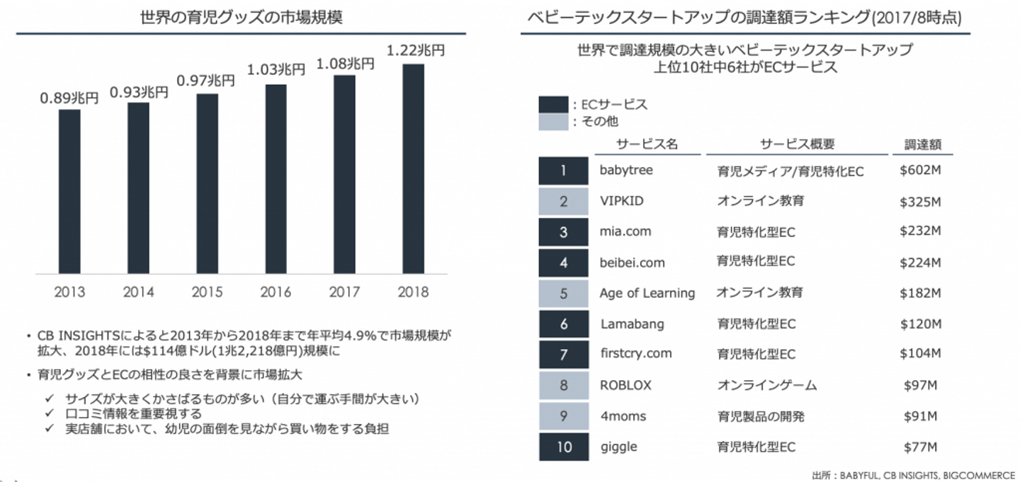 こうした背景もあり、2017年8月時点のベビーテックスタートアップ領域における調達額ランキングでは、上位10社のうち6社がECサービスとなっています。