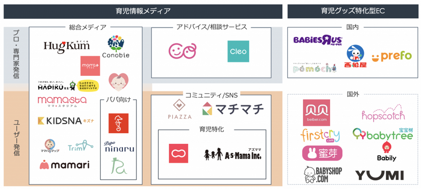 国内における育児情報メディア、ならびに国外を含めた育児グッズ特化型ECの主要プレイヤーを以下のように分類しました。