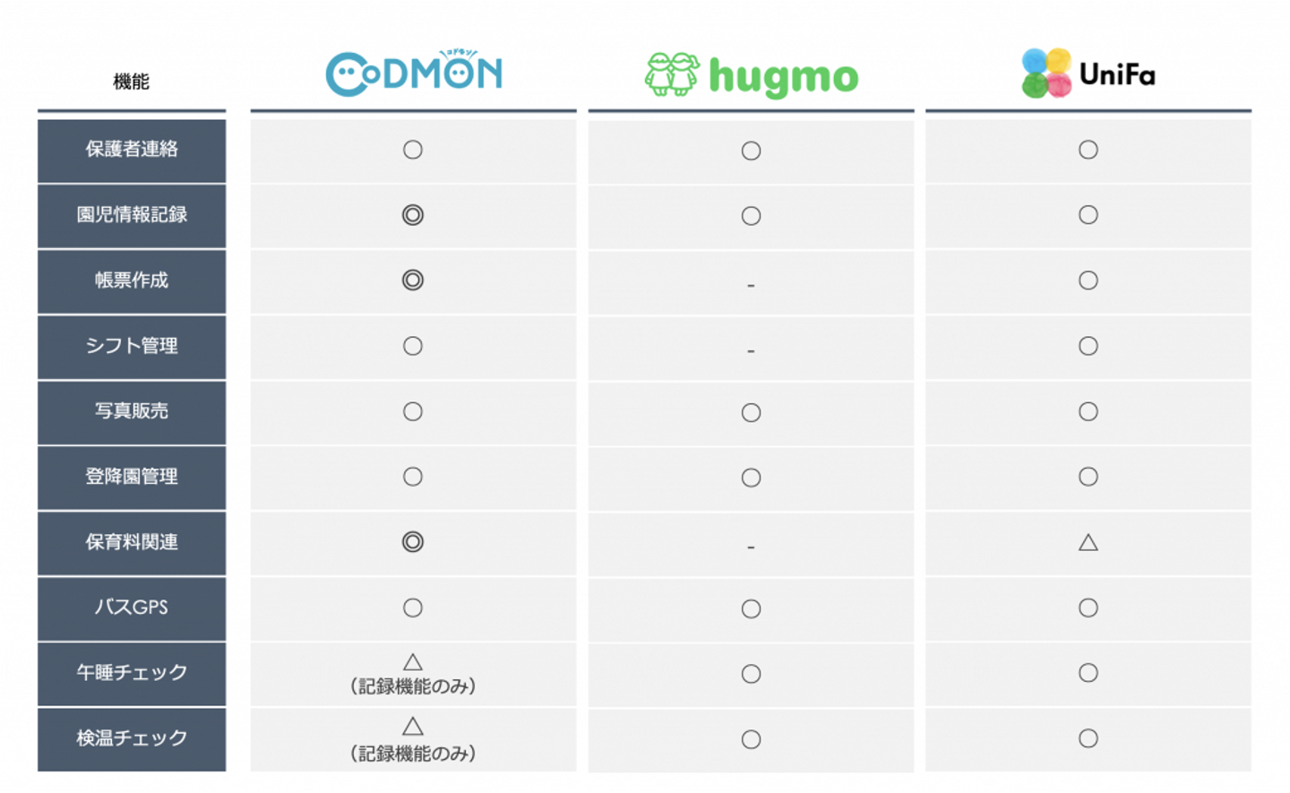 hugnoteは、保護者への連絡や写真共有が可能な連絡帳機能を強みとしています。さらに、Webページによると、帳票作成機能・保育料金の自動計算機能などが現在開発中となっており、今後はCoDMONのように施設運営を効率化するための機能開発にも注力していくことが予測されます。