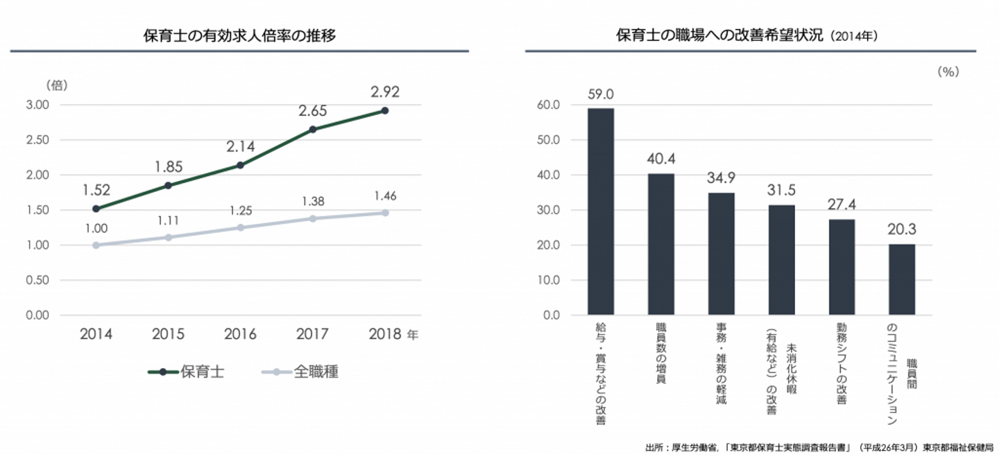 こうした状況の背景には、多くの保育士が待遇面や労働環境面に不満を抱いていることがあります。少し古いデータですが、2014年に東京都福祉保健局が実施した「東京都保育士実態調査報告書」によると、保育士が職場に望む改善事項として、「給与・賞与などの改善」「職員数の増加」「事務・雑務の軽減」などが挙げられました。この結果からは、業務の大変さと報酬が見合っていないことや、業務が膨大で手が回っていない現場の状況が見えてきます。また、こうした不満が、保育士の高い離職率や、保育士資格を持っているにもかかわらず、保育に関係した仕事はしていない潜在保育士の多さに直結しています。