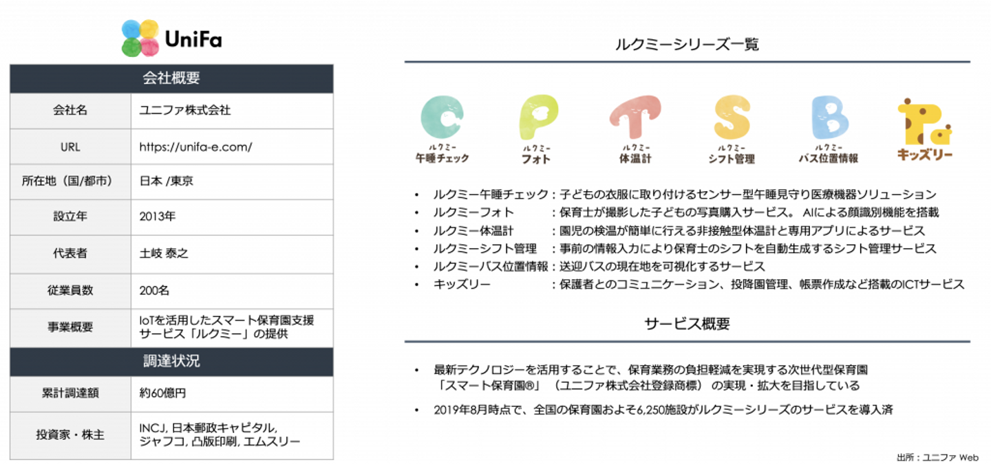 2019年9月には、エムスリー・凸版印刷といった事業会社や複数の金融会社から35億円という巨額の調達を実施しています。今後は、出資元各社とも協力しながら保育施設へのルクミーシリーズ導入を加速し、同社が定義するテクノロジー活用次世代型保育園「スマート保育園®(ユニファ社登録商標)」を全国に拡大させていくと発表しています。