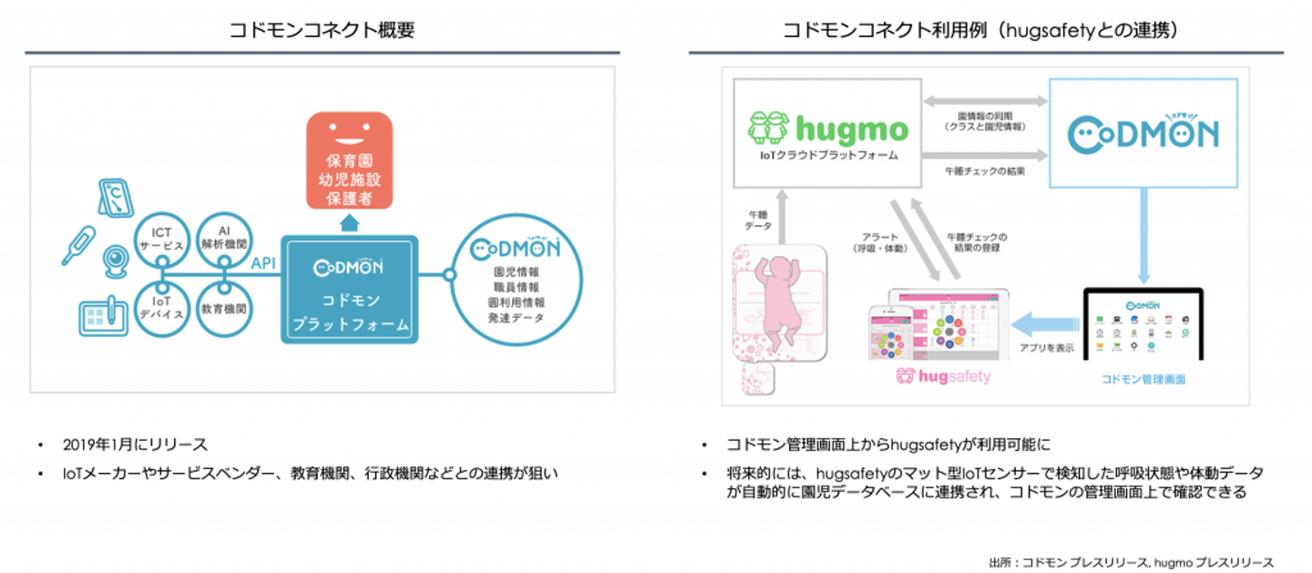 直近では、「コドモンコネクト」というオープンAPIを通じて、外部サービスとCoDMONの連携を推進する動きが目立っています。連携が完了したサービスはCoDMONのホーム画面から利用できるようになるため、保育士は様々なサービスへのアクセスが容易になり、サービス開発企業は豊富な導入実績を誇るCoDMONの顧客施設へリーチできるようになります。この後ご紹介する午睡検知IoTソリューションhugsafetyと2019年4月に連携したことを皮切りに、これまでおよそ10のサービスと連携を実現しています。