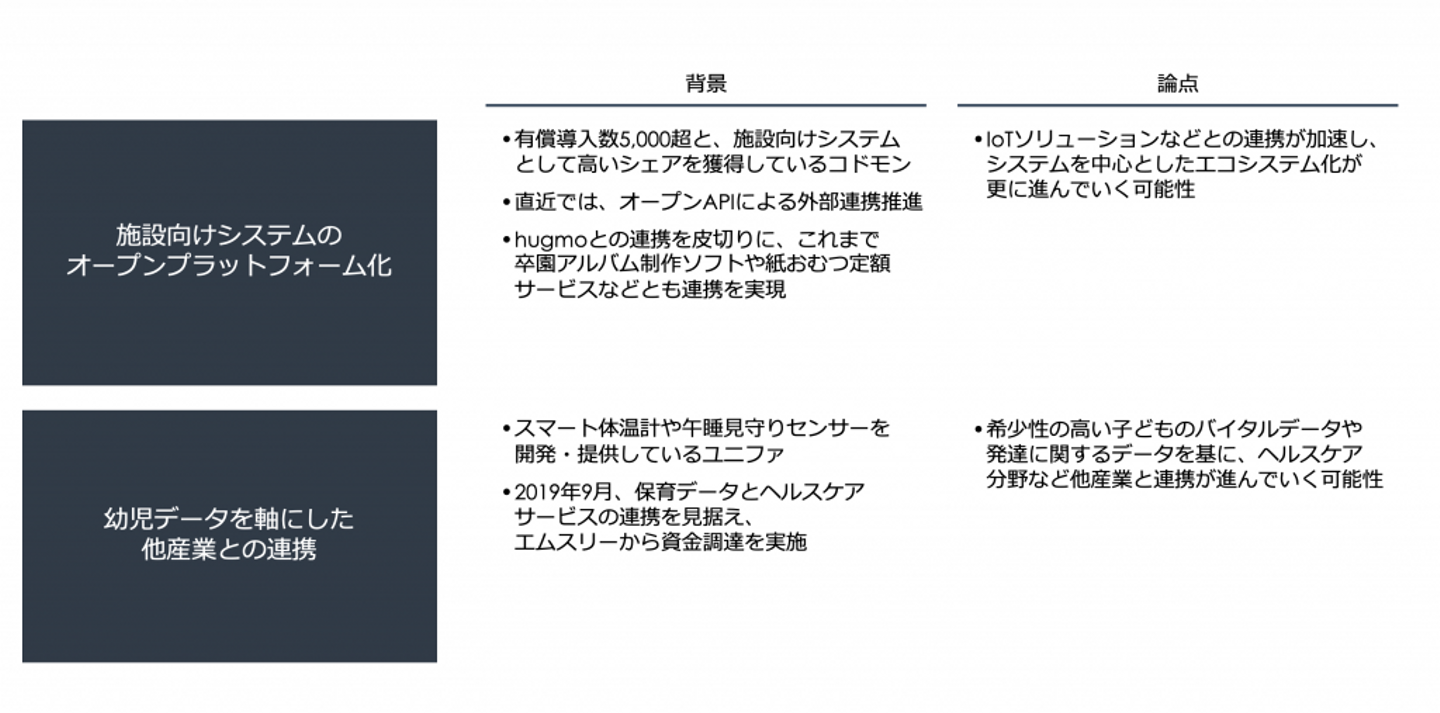 今後、乳幼児のバイタルデータ収集においては、今回ご紹介した午睡見守りソリューションをはじめとした施設向けサービス領域が主戦場となるのではないでしょうか。また、ユニファ社がエムスリーから出資を受けているように、子どものバイタルデータ獲得を目的にしたヘルスケアサービス提供企業の参入や、施設向けサービスとの連携も進んでいく可能性があります。