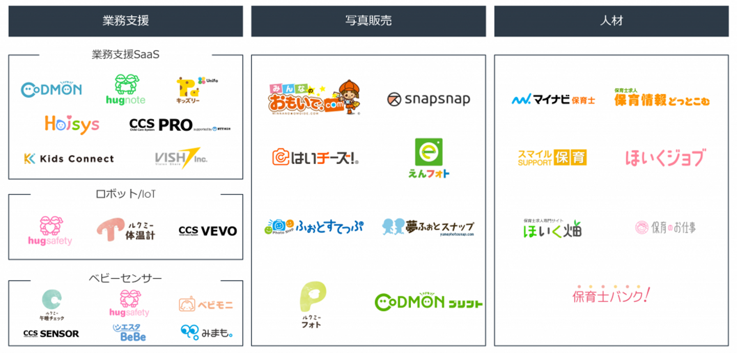 オンライン連絡帳をコアとした保護者とのコミュニケーションサポートソリューション「hugnote(ハグノート)」、子どものお世話をサポートするIoTセンサーソリューション「hugsafety(ハグセーフティ)」が主力プロダクトです。