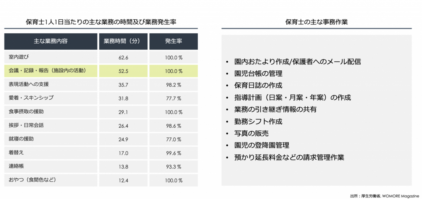 保育士にとって、子どもたちとのコミュニケーションこそが付加価値であり、必要不可欠な仕事だとするならば、業務時間・発生率ともに上位を占める事務作業は効率化したい業務と言えるでしょう。