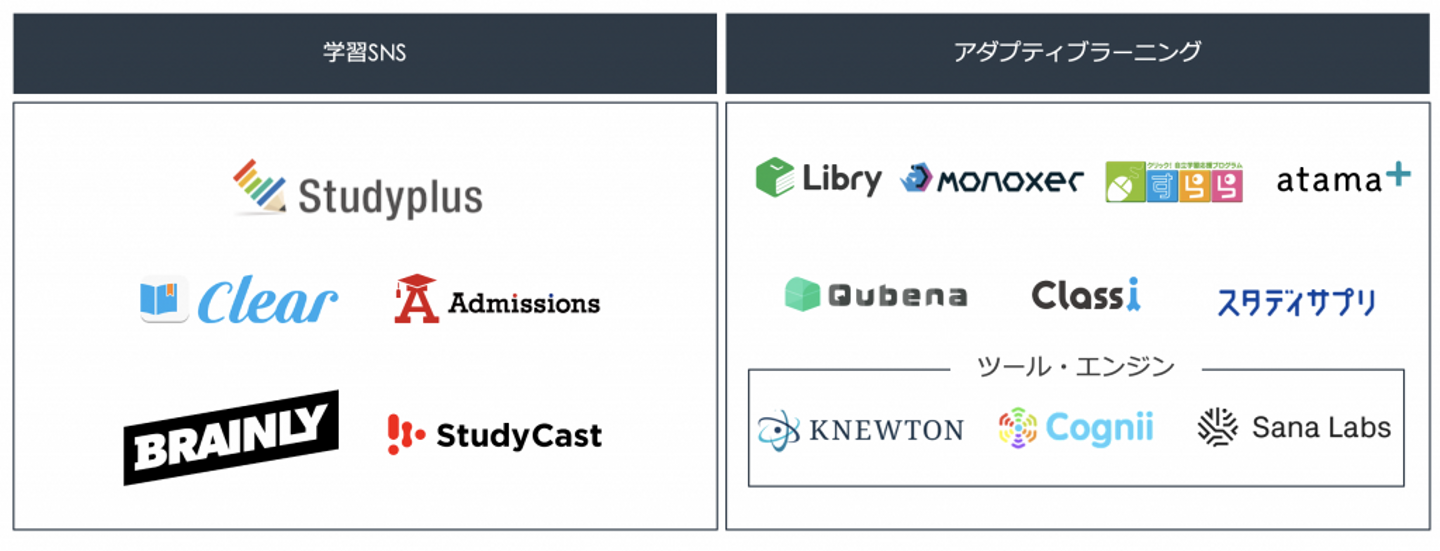 学習SNSは、競争心やサボりにくい強制力を与えつつ、互いに教えあうことで学習効率の向上に寄与し、アダプティブラーニングサービスは個人の理解度に応じて学ぶべきコンテンツをレコメンドして学習効率を向上に寄与しています。
