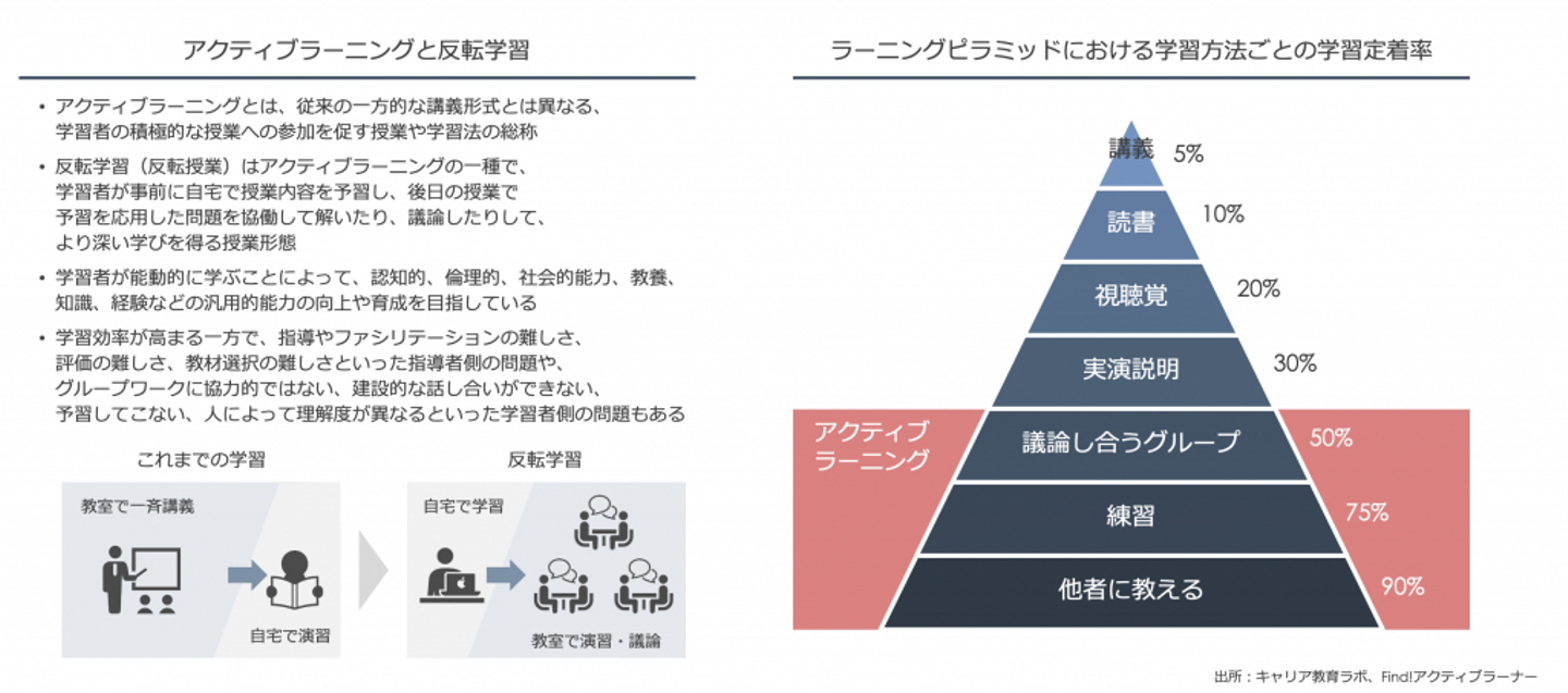 この数年で、アクティブラーニングの代表格である反転学習(反転授業)を取り入れている学校や塾が増えてきました。これは学習者が事前に自宅で授業内容を予習し、後日の授業で予習を応用した問題を協働して解いたり、議論したりして、より深い学びを得る学習・授業形態です。