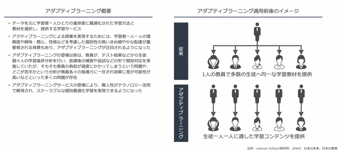 このような背景とテクノロジーの発展もあり、アダプティブラーニングが注目されるようになりました。アダプティブラーニングのテクノロジーによって、属人性が解消され、スケーラブルな個別最適化学習を実現できるようになってきたのです。つまり、これまで一対多の集合学習で均一な学習内容を提供していたものが、生徒一人ひとりに最適な学習内容を提供するような形態、いわば生徒一人ひとりに指導者がついているかのような形となってきているのです。