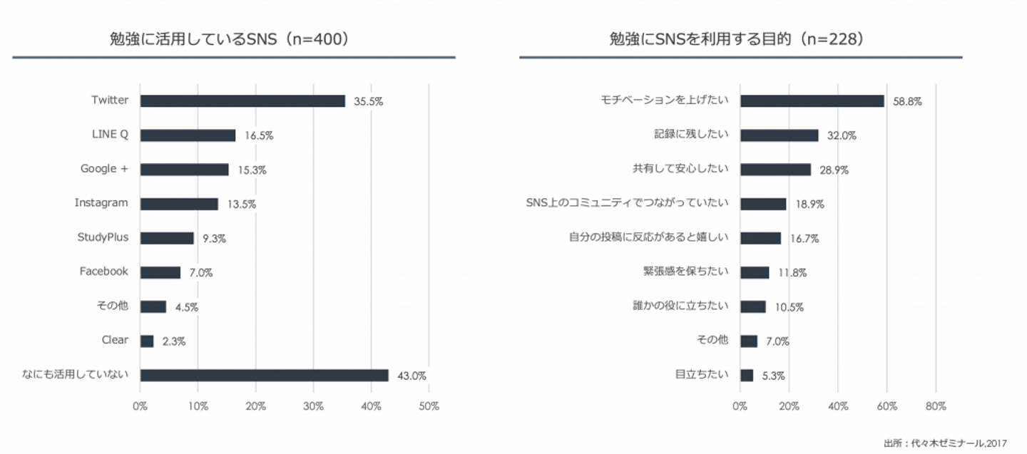 代々木ゼミナールが2017年に行った調査(全国の15歳~18歳の高校生400名が対象)によると、実に、学生の半数以上が勉強にSNSを活用、3人に1人以上が利用していとのことでした。SNSの勉強専用アカウントについて聞くと、「自分も勉強専用アカウントを持って活用している(5.5%)」と回答したのはわずかだったものの、「勉強専門アカウントを持っていないが閲覧している(17.8%)」「興味はあるがなにもしていない(28.0%)」と合わせて全体の半数以上が興味を持っていることがわかりました。