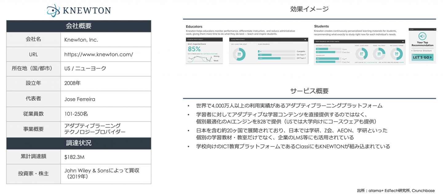 前述のatama+のように、学習者に対してアダプティブな学習コンテンツを直接提供するのではなく、個別最適化のAIエンジンをB2Bで提供しています(USでは大学向けにコースウェアも提供)。