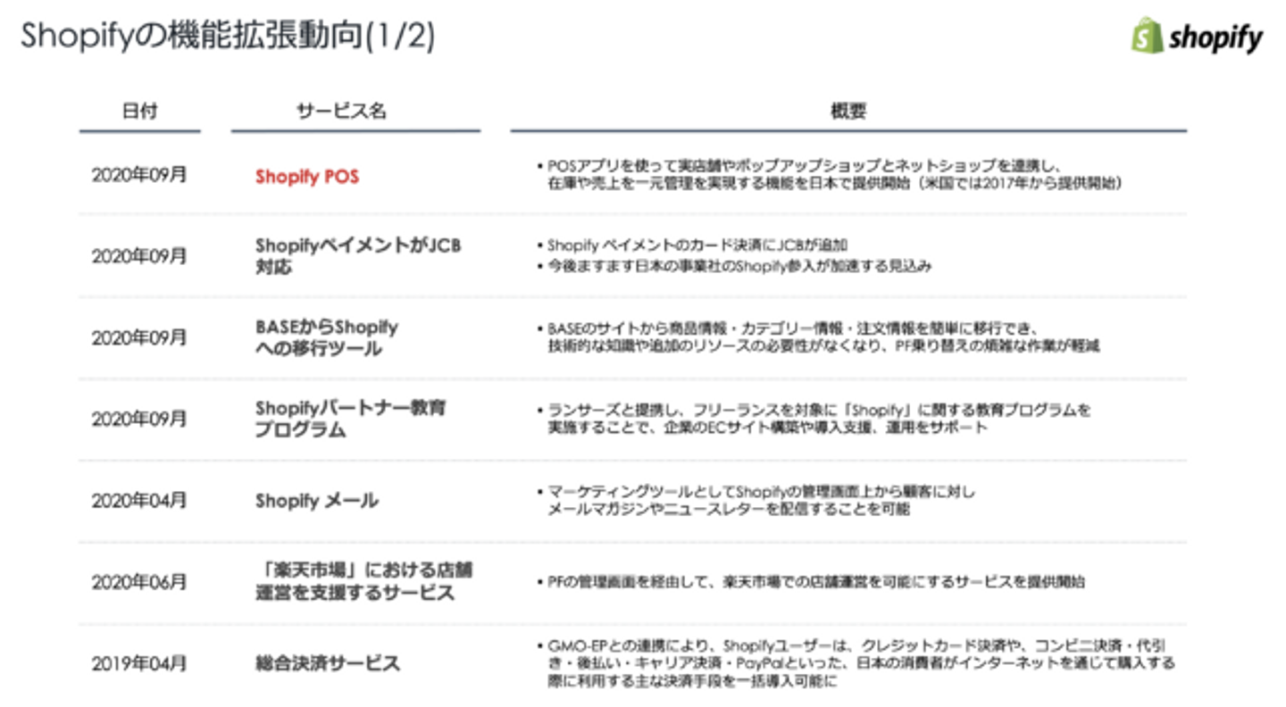以上の2社は、対象ターゲットや決済手数料をはじめとした細かい機能などの差が存在するものの、EC構築支援のプラットフォームとして、様々な機能をスピーディーに追加・拡張しています。そこで、それぞれ近年の主な動向についても整理しました。