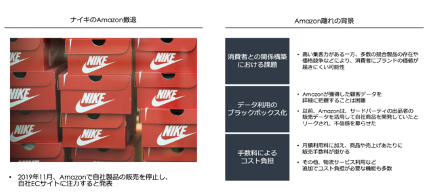 一方、近年は「Amazon離れ」と呼ばれる現象も起こっています。「Amazon離れ」とは、従来Amazon上で商品を販売していた事業者が販売を取りやめることで、特にブランドイメージを重視する大手事業者がAmazonプラットフォーム上から撤退する動きをみせています。例えば、2019年11月ナイキがAmazon上での販売を停止し、大きな話題となりました。その他にも、ルイ・ヴィトン、ディズニーなどがAmazonから撤退し、ニュースとなっています。