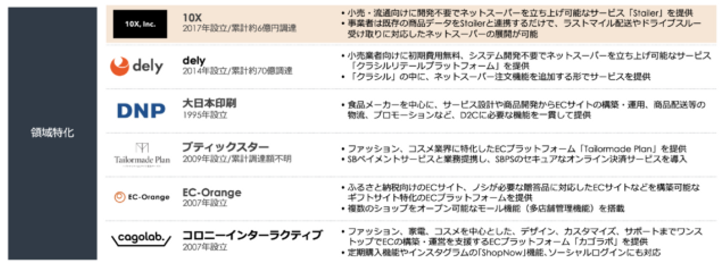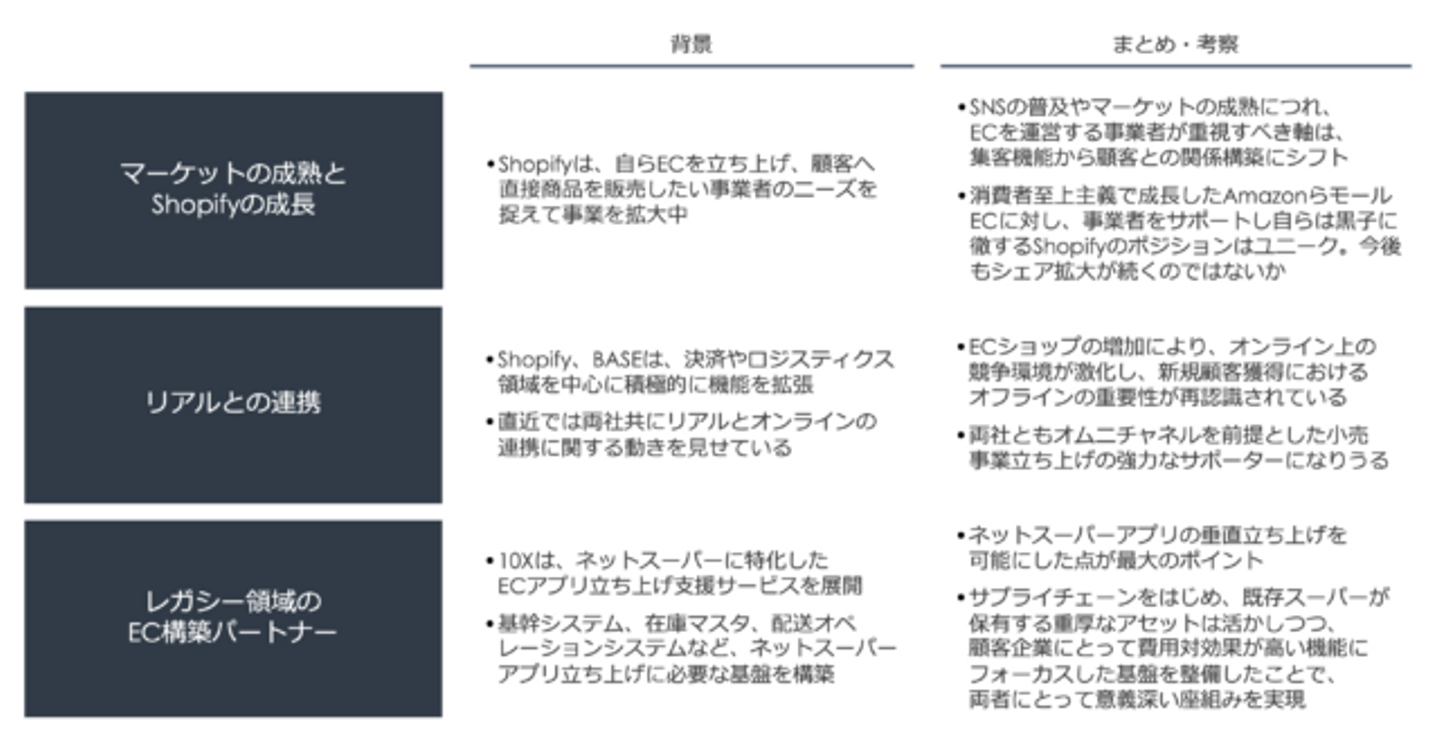 小売事業者にとってボトルネックとなっていた追加のシステム開発を不要とし、アプリの垂直立ち上げを可能している点は非常に示唆深いです。小売・流通事業者にとっては、既存の仕組みを活用して比較的ライトにUI/UXの優れたネットスーパーアプリを開発することができるため、費用対効果が大きく、10Xは、事業者が保有するサプライチェーンなどの重厚なアセットを活かしながらネットスーパー立ち上げをサポートするという独自のポジションを確立しています。Stailerが提供している機能は、既に小売・流通事業者と関わりあるSIerらが苦手としている分野で、今後も導入が進むのではないかと考えられます。また、こういった事業領域の狙い方や座組みは、様々な事業開発や、その他のレガシー領域のデジタル化においても参考になるのではないでしょうか。