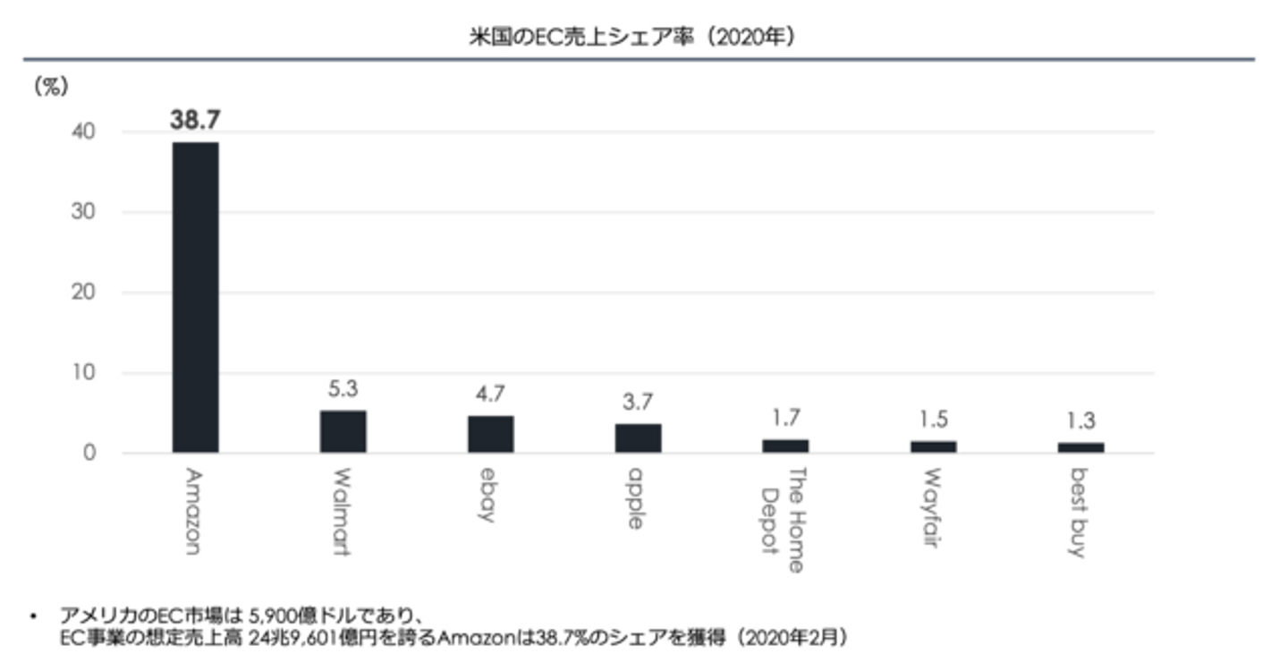Amazonは、eコマースで圧倒的なパワーを誇る企業のひとつです。2020年の米国EC市場においておよそ40%のシェアを占めており、他の追従を許していません。これは米国のデータではありますが、日本国内においても、Amazonの影響力は身近に感じられるのではないかと思います。