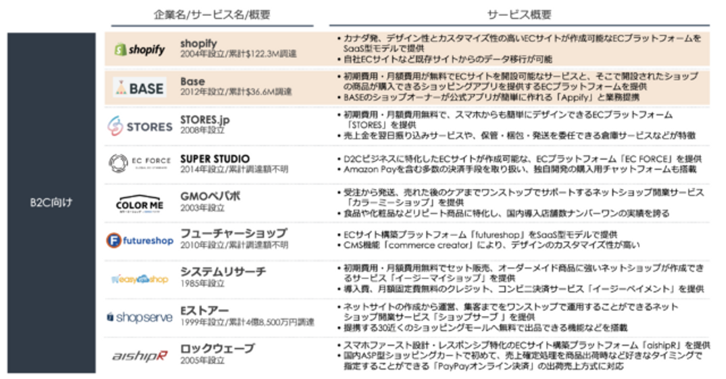 今回、様々なEC構築支援サービスを、B2C向け・B2B向け・領域特化型の3種類に分類し、以下に一覧化しました。今回はこの中から注目のサービスを紹介します。