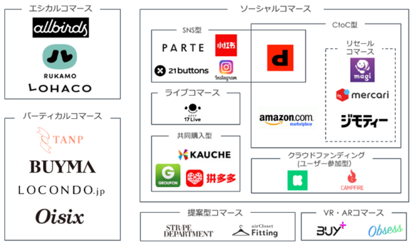 ご紹介した5つの新しいEC形態に属する主要なプレイヤーを下記のように整理しました。