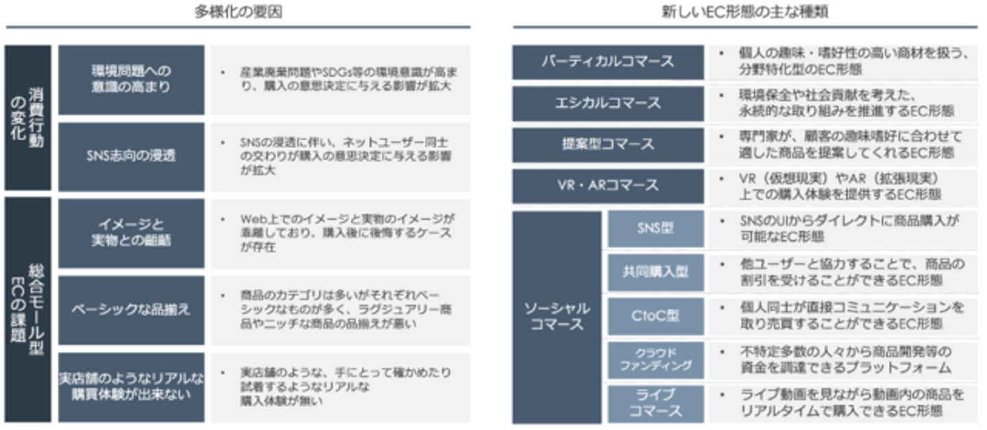 一方で、近年、ユーザーの消費行動の変化や、既存の総合モール型ECの課題に着目・対応した新しいECが登場しており、その種類も多様化しています。例として、環境問題に特に配慮したエシカルコマースや、ユーザー間の繋がりを活用したソーシャルコマース、商品分野を特化したバーティカルコマースなどがあります。これらが台頭する背景として、以下の5つが代表的な要因として挙げられます。
