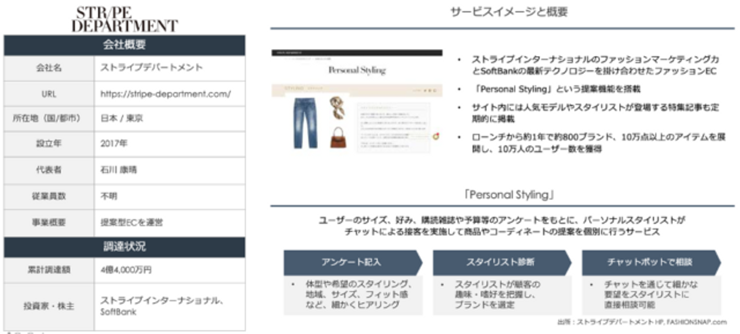 ストライプデパートメントは、「earth music & ecology」等のアパレルブランドを展開するストライプインターナショナルとソフトバンクが合弁で2018年に設立した、高品質ブランドのファッションに特化した提案型ECです。設立から約1年で約800ブランド、10万点以上のアイテムを展開し、10万人のユーザーを獲得しています。