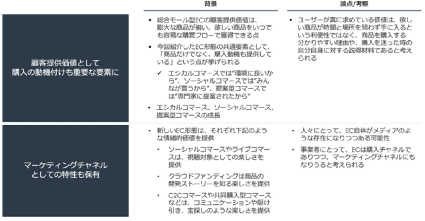 総合モール型ECの顧客提供価値は、膨大な商品が揃い、欲しい商品を時間と場所を問わず容易な購買フローで獲得できるという利便性にあります。一方、今回ご紹介した様々なECに共通する1つの要素は「商品だけでなく、購入動機も提供している」という点です。エシカルコマースでは”環境に良いから”、ソーシャルコマースでは”みんなが買うから”、提案型コマースでは”専門家に提案されたから”といった理由が購入の大きな動機付けとなっています。